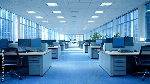 Blank and open office space, modern furnishings, natural light streaming through windows