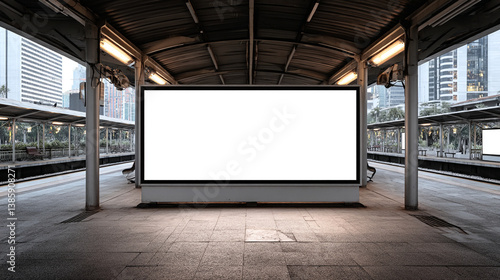Blank billboard at a train station platform with city buildings in the background during the daytime