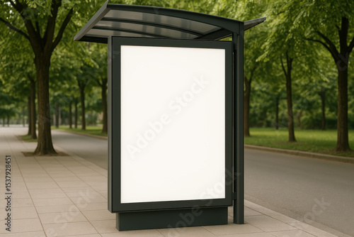 Blank bus stop billboard displaying advertising space in urban park setting
