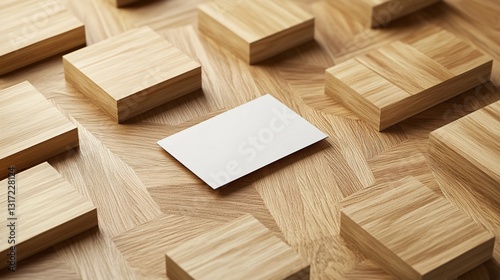 Blank card is on a wooden floor, surrounded by wood blocks