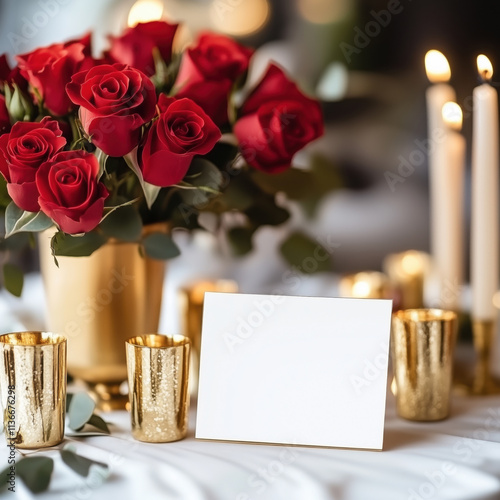 Blank card mock up on the table decorated with red roses and candles