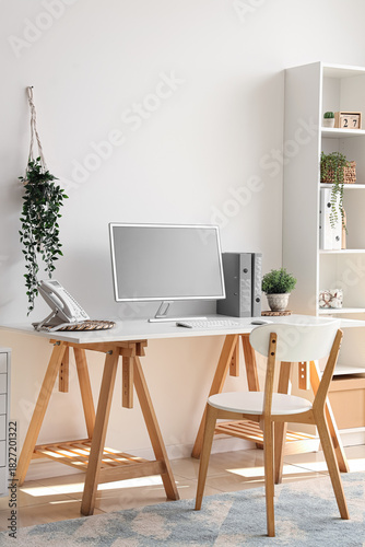 Blank computer monitor with telephone on table in light office
