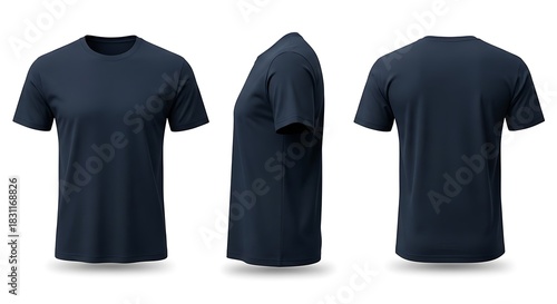 Blank Dark Blue T-Shirt Mockup. Front, Side, and Back Views of a Plain Navy Blue Round Neck T-Shirt Isolated on White Background for Design Template.