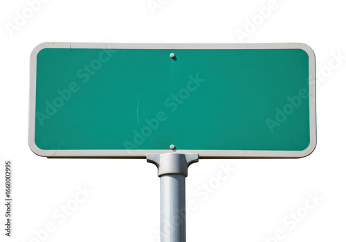 Blank green street sign mounted on white post against a dark backdrop transparent background