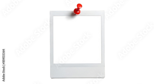 Blank instant film photo frame attached to a surface with a red pushpin, isolated on transparent background