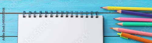 Blank notepad with bright colored pencils on wooden table background for creative projects and education