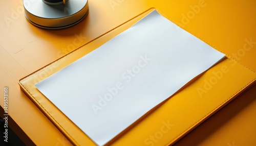 Blank paper on a folder, yellow desk, copy space, mockup, background