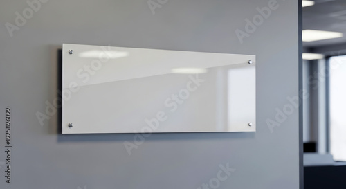 Blank rectangular acrylic wall plaque is mounted securely to a modern gray office partition wall awaiting corporate signage.