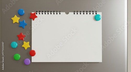 Blank spiral notepad with colorful magnets on metal surface