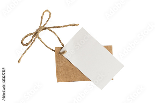 Blank tied label isolated on white background. Clothing label mockup with copy space.