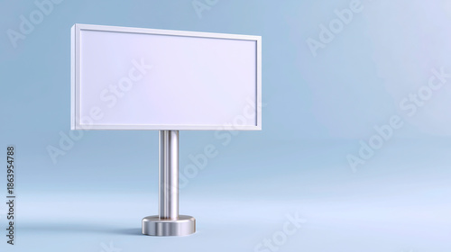 Blank white billboard on sleek metallic stand against a soft blue studio background with floor reflections. Concept of professional outdoor advertising and branding mockup