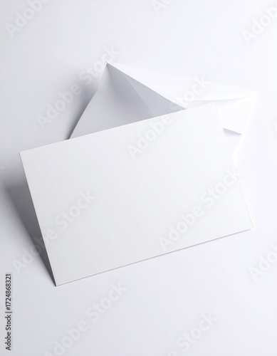 Blank white card and envelope on a white background, slightly angled. Soft shadows cast. Minimalist design