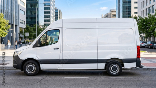 Blank white commercial delivery van mockup on city street.