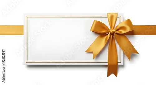 Blank white gift tag with gold ribbon and bow on a white background, top view