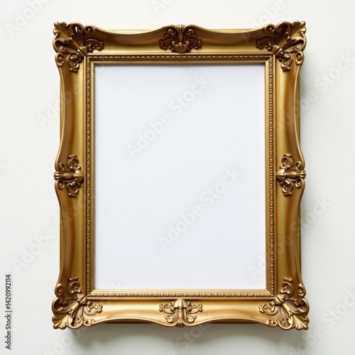 Blank white paper sheet inside a classic photo frame on white backdrop, wall, empty, copy