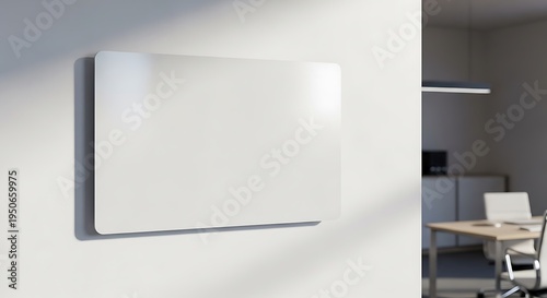 Blank white rectangular whiteboard mounted on a white wall in a modern office setting with desk and chairs in the background