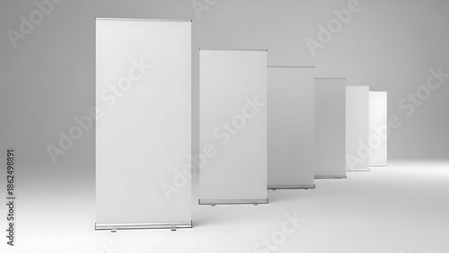Blank White Roll Up Banner Stands Lined Up in a Row.