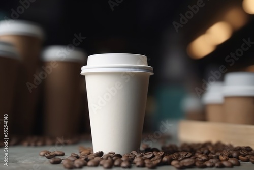 Blank white takeaway coffee cup mockup template cafe background surrounded by coffee beans generative AI