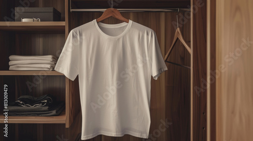 Blank white t-shirt mockup on a hanger against a wardrobe background