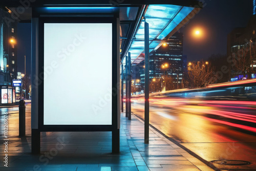 Blank white vertical digital billboard poster on city street bus stop sign at night. Street advertising bus stop mockup