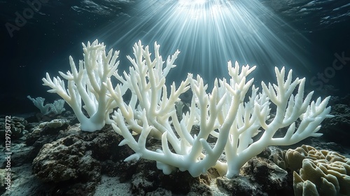Bleached coral reef underwater. Sunbeams shine on pale white coral. Ocean eco disaster. Climate change effect. Ocean life impacted by global warming. Underwater coral ecosystem. Underwater coral reef