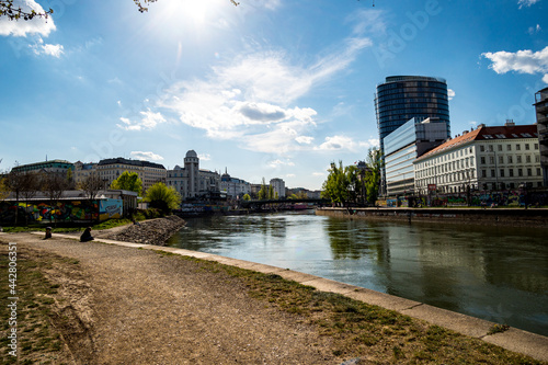 Blick auf den Donaukanal und Urania in Wien