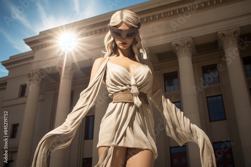 Blindfolded Lady Justice in front of courthouse, noon light, full body shot