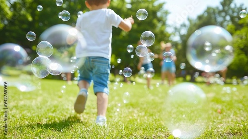 Blissful Moments: Kids Having Fun Playing with Bubbles in a Sunlit Park