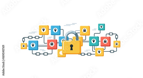 Blockchain security concept. Network of interconnected blocks with lock representing data protection and encryption. Vector illustration.
