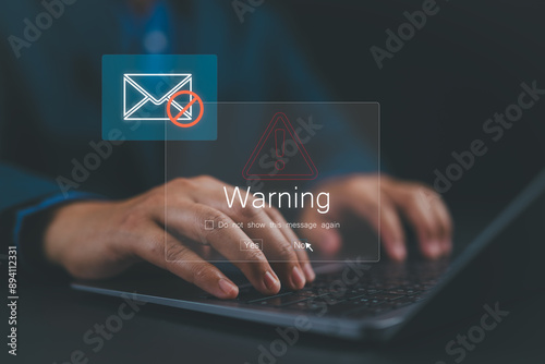 Blocking spam e-mail, warning pop-up for phishing mail, network security concept. Business man working on laptop computer at home with warning window on screen