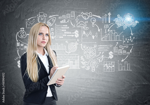 Blond woman with a copybook, scheme