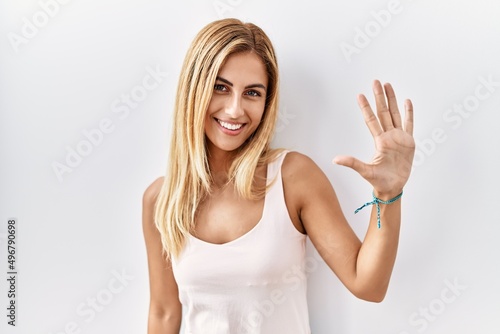 Blonde beautiful young woman standing over white isolated background showing and pointing up with fingers number five while smiling confident and happy.