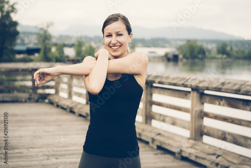 Blonde Caucasian Woman Stretching Triceps before or after workout