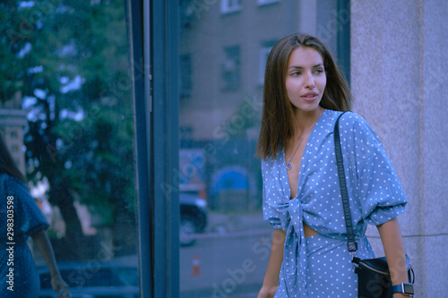 Blonde girl in long blue dress and a small black handbag on her shoulder is posing by the glass door, walking alone in the city. Fashion. Close-up.