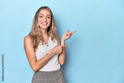 Blonde young caucasian woman in blue studio excited pointing with forefingers away.