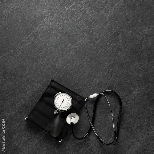 Blood pressure meter and stethoscope from above on dark stone background with space for notes, text - Bilder