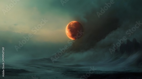 Blood Red Moon Over a Foggy Alien Landscape