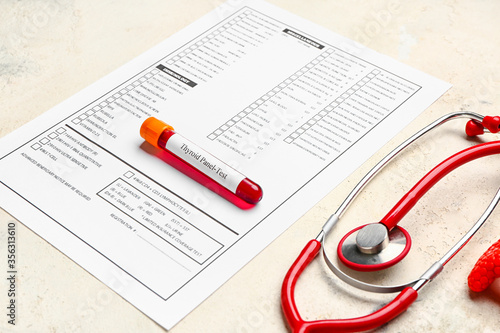 Blood sample in tube with stethoscope and laboratory test form on white background. Concept of thyroid disease
