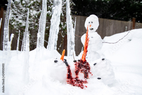 Bloody dead snowman impaled on a sharp icicle during a winter storm