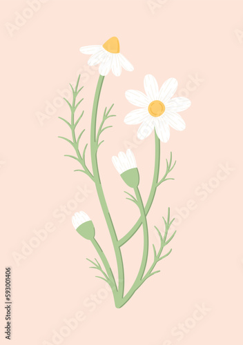Blooming chamomile or daisy flower on a light pink background. Stylized botanical vector illustration in flat style. Floral design element.