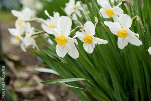 Blooming daffodils in spring in the garden. Growing and caring for daffodils.