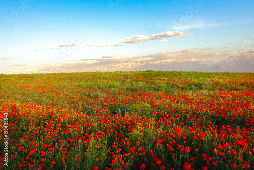 Blooming red poppy fields with mountain landscape in the background in Kazakhstan