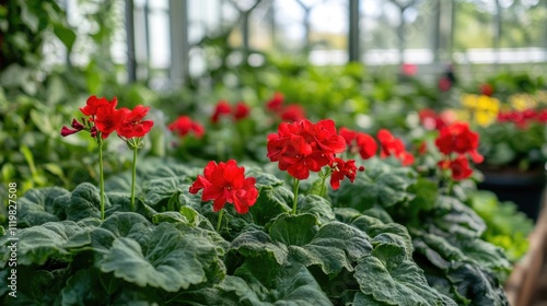 Blooming vibrant red geraniums in a lush botanical garden filled with greenery on a sunny day showcasing nature's beauty.