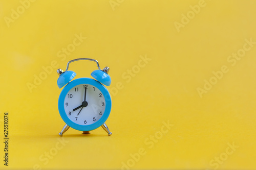 Blue alarm clock on yellow background. Minimalism. Contrast concept.