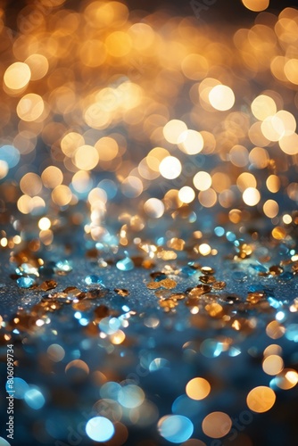 Blue and gold glitter background with blurred lights