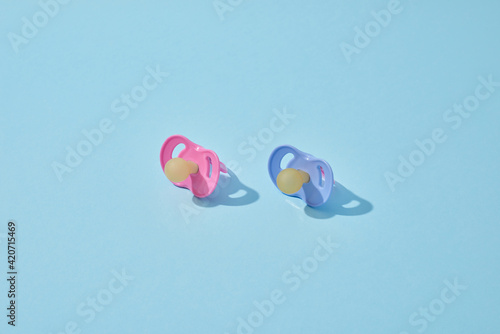 Blue and pink orthodontic baby pacifiers.