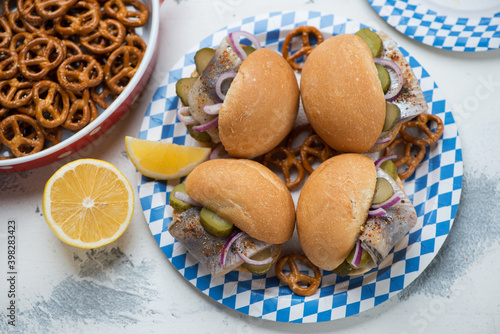 Blue and white carton plate with german fish sandwiches and mini pretzels over white concrete background, horizontal shot
