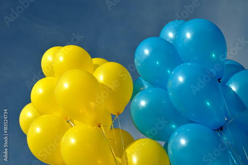 blue and yellow balloons in the city festival on dark blue sky background
