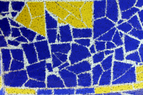 blue and yellow colours of Ukraine broken plate ceramic mosaic in Anton Gaudi style