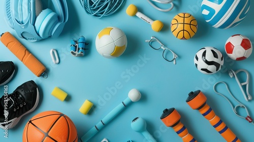 Blue Background Featuring a Set of Sports Equipment in Top View